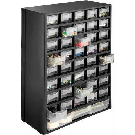 Alles auf einen Blick, alles sauber getrennt: Das vielseitige Kleinteilemagazin von tectake schafft Ordnung mit System. Die 41 transparenten Schubfächer eignen sich ideal als Aufbewahrungsort für Schrauben, Bauteile, Lego, Schmuck und vieles mehr. Die flexiblen Module können komplett herausgenommen und gestapelt werden. Bei Bedarf lässt sich die Zahl der Fächer durch Trennstege auf das Doppelte erhöhen. Die zwei Aufhängemöglichkeiten des stabilen Kunststoffgehäuses garantieren auch voll bestückt einen festen Halt an der Wand. Kein Durcheinander, kein lästiges Suchen mehr, mit dem praktischen Kleinteilemagazin von tectake.