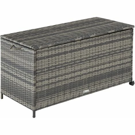 Die vielseitig nutzbare Auflagenbox Kuusamo von tectake verbindet einen großen Stauraum mit einer attraktiven Optik. Das ansprechende Geflecht besteht aus widerstandsfähigem Polyrattan, das stabile Gestell aus rostfreiem Aluminium – eine optimale Kombination für den ganzjährigen Einsatz im Außenbereich. Unter dem verstärkten Deckel mit seinem leichtgängigen Öffnungsmechanismus bietet die herausnehmbare Innenverkleidung aus atmungsaktivem Polyester zusätzlichen Schutz vor Wind und Wetter. Dank der praktischen Griffschlaufe, der beiden komplett drehbaren Rollen mit Feststellbremse und dem geringen Gewicht wird das Umstellen der funktionalen Aufbewahrungsbox zu einer komfortablen Angelegenheit.