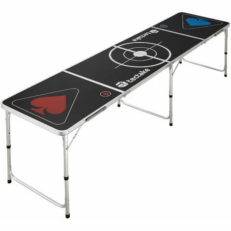 Am angesagten Bier-Pong-Tisch Spring Break von tectake können alle ihre Zielgenauigkeit unter Beweis stellen. Das klappbare Partyset ist mit wenigen Handgriffen einsatzbereit und auf zwei Höhen einstellbar. Die rostfreie Aluminium-Konstruktion besitzt abgerundete Ecken und hält auch heißen Ballwechseln auf dem Spielfeld stand. Ein weiterer Vorteil ist der geringe Reinigungsaufwand des Tisches – einfach kurz mit klarem Wasser abwaschen und weiter geht’s.