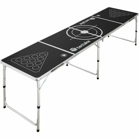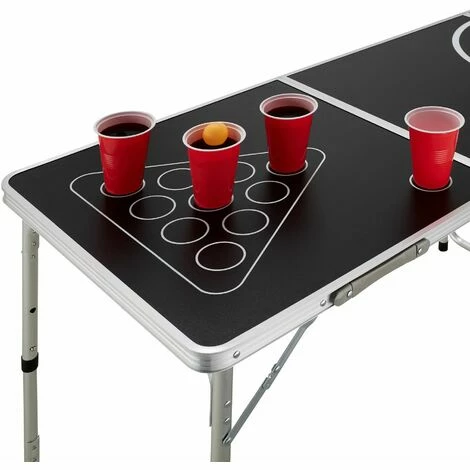 Mit dem unterhaltsamen Bier-Pong-Tisch Tijuana von tectake ist ausgelassene Stimmung garantiert! Das tragbare Partyspiel kommt als Komplettset mit vielen Bechern und mehreren Bällen. Für die nötige Stabilität sorgt das rostfreie Aluminiumgestell, die Kunststoffkappen an den Fußenden schonen den Boden und erhöhen die Standfestigkeit. Die stylisch gestaltete Oberfläche des Klapptisches besitzt zum Schutz abgerundete Kanten und lässt sich leicht reinigen – einfach mit einem feuchten Tuch abwischen, schon kann die nächste Partie beginnen.