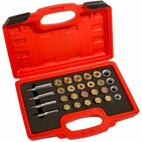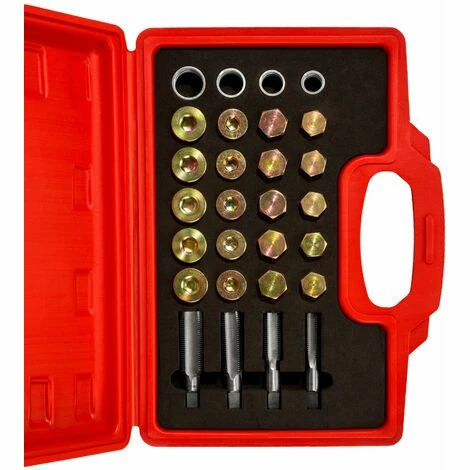Repariere mit unserem Reparaturset für Ölablassschrauben Gewinde von Ölwannen und Getrieben einfach und schnell. Gewindebohrer, Dichtringe und Ölablassschrauben in den Größen M13, M15, M17 und M20 sind im Reparatur Set vorhanden. Die mitgelieferten Teile sind nicht nur für Autos, sondern auch für diverse Nutzfahrzeuge geeignet. Praktisch: Das komplette Reparaturset wird in einem übersichtlichen und handlichen Kunststoffkoffer geliefert. Lege gleich los, mit dem Reparaturset für Ölablassschrauben von tectake.