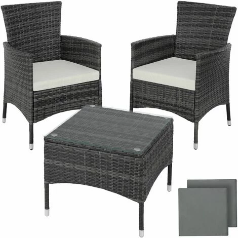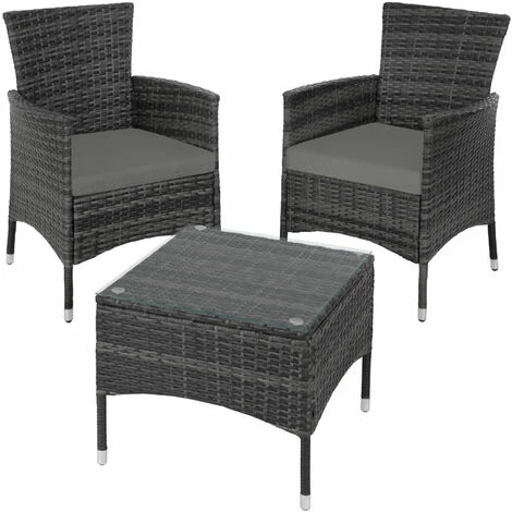 Ob auf dem Balkon, der Terrasse oder im Garten: Mit dem Rattanset Luzern von tectake lässt sich der Sommer zu Hause optimal genießen. Durch ihre kompakte Form benötigt die Sitzgruppe aus zwei Stühlen und einem kleinen Tisch mit Glasplatte nicht viel Platz und lässt sich nahezu überall aufstellen. Ihr geringes Gewicht macht sie ideal für den Transport. Einmal aufgestellt verleiht das Stahlgerüst ein Maximum an Stabilität. Die Sitzkissen aus Polyester sind farblich top auf die Rattangarnitur abgestimmt. Das schicke Set vereint hohen Sitzkomfort mit einem minimalen Pflegeaufwand. Um die Polster vor Durchfeuchtung zu schützen, ist die Oberfläche imprägniert – Schmutz und Wassertropfen perlen einfach ab. Relaxe sorgenlos noch heute in Deinem Rattanset Luzern von tectake.