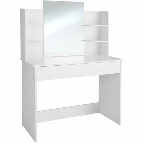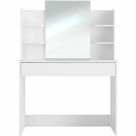 Am Schminktisch Camille von tectake kannst Du Dich gekonnt in Szene setzen. Dank des großen Spiegels hast Du beim Zurechtmachen immer alles im Blick. Die unterteilte Schublade und die offenen Ablagen bieten viel Stauraum und ermöglichen eine ausgezeichnete Sortierung für Pinsel, Foundation, Mascara, Lidschatten, Rouge und Co. Die Fertigung aus robusten Spanplatten mit widerstandsfähiger Melamin-Oberfläche macht den Schminktisch zu einem treuen Helfer bei vielen Stylings.