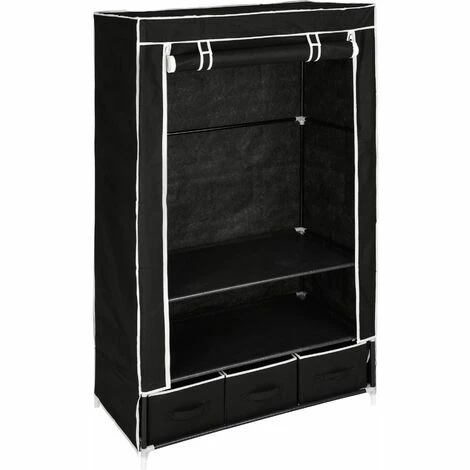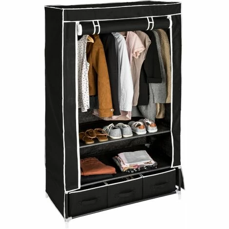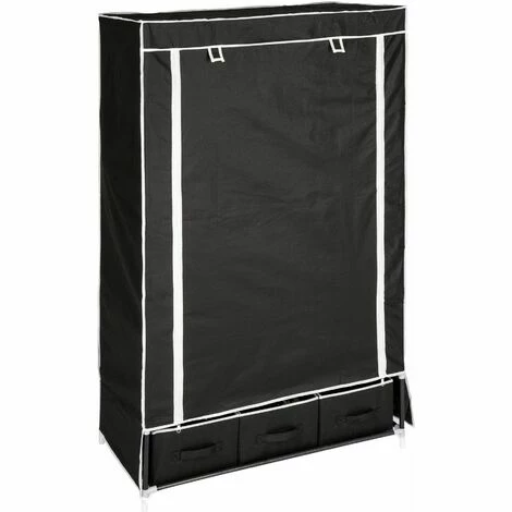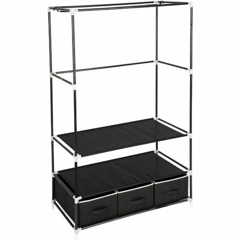 Der praktische Stoffschrank 3 Fächer inkl. 3 Boxen von tectake bietet maximalen Stauraum bei wenig Platzbedarf. Das stabile Gestell aus Stahl und robustem Überzug garantiert schnellen Zugriff auf Deine Kleidung. Ein Türvorhang mit Klettverschlüssen und Reißverschlüssen schützt vor Staub und Schmutz. Die Kleiderstange für Kleider, Hosen, Gürtel und Krawatten ist bis zu 25 kg belastbar. Im unteren Fach und in den drei Schubfächern lassen sich bequem Pullover, T-Shirts, Unterwäsche, Schuhe usw. verstauen. Mit seinen Maßen lassen sich auch Platzgelegenheiten optimal nutzen, für die andere Schränke zu groß sind. Mit seinem geringen Gewicht ist der Textilschrank ideal für den Transport geeignet. Jedes Fach ist mit bis zu 3 kg belastbar. Der Zusammenbau im simplen Stecksystem ist denkbar einfach und ohne Werkzeug möglich. Ob im Zimmer, Flur, Treppenhaus, Keller, auf dem Dachboden oder in der Studentenbude, der schicke Kleiderschrank von tectake passt in jede Umgebung.