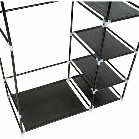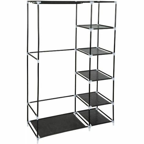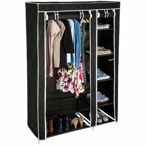 Der praktische Stoffschrank 6 Fächer von tectake bietet maximalen Stauraum bei wenig Platzbedarf. Das stabile Gestell aus Stahl und robustem Überzug garantiert schnellen Zugriff auf Deine Kleidung. Zwei Türvorhänge mit Klettverschlüssen und Reißverschlüssen schützen vor Staub und Schmutz. Die Kleiderstange für Kleider, Hosen, Gürtel und Krawatten ist bis zu 25 kg belastbar. Mit seinen Maßen lassen sich auch Platzgelegenheiten optimal nutzen, für die andere Schränke zu groß sind. Mit seinem geringen Gewicht ist der Textilschrank ideal zum Transport geeignet. In den fünf kleineren Fächern lassen sich bequem Pullover, T-Shirts, Unterwäsche, Schuhe usw. verstauen. Jedes Fach ist mit bis zu 5 kg belastbar. Der Zusammenbau im simplen Stecksystem ist denkbar einfach und ohne Werkzeug möglich. Ob im Zimmer, Flur, Treppenhaus, Keller, auf dem Dachboden oder in der Studentenbude, der schicke Kleiderschrank von tectake passt in jede Umgebung.