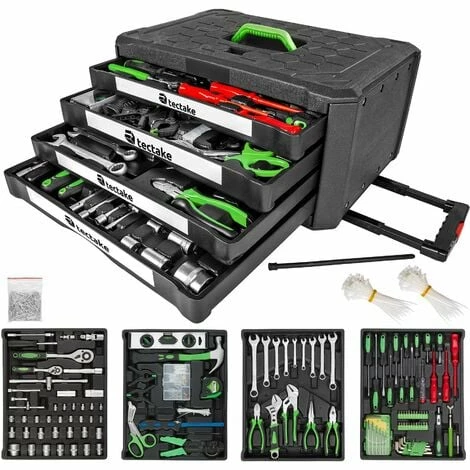 Praktischer Trolley Werkzeugkoffer mit 899 Teilen. Das Werkzeug besteht zu einem Teil aus Chrom Vanadium. Im hochwertigen Koffer sind viele Werkzeuge wie Zangen, Schraubendreher und viel Zubehör auf 4 Ebenen platzsparend untergebracht. Unser Werkzeug ist sowohl für den Hausgebrauch im Alltag, aber auch für Profis super geeignet. Der Werkzeugkoffer verfügt über Rollen und einen Teleskopgriff zum Ziehen.