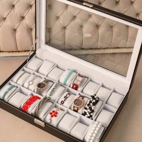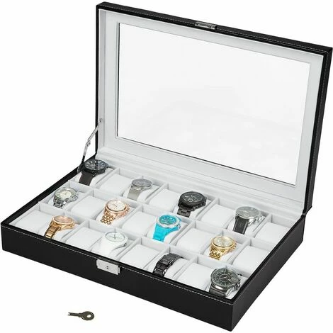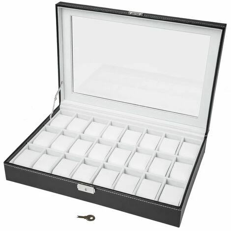 Die Uhrenbox von tectake ist ein praktischer wie eleganter Aufbewahrungsort für deine Lieblingsuhren. Mit einem Sichtfenster ausgestattet bietet die Box Platz für bis zu 24 Uhren. Nicht nur das Design der Uhrenbox überzeugt, außerdem schützt sie Deine wertvollen Lieblingsstücke auch gegenüber Staub, Stößen und Kratzern. Der Innebereich ist mit Samt ausgekleidet. Die Uhrenbox von tectake kann mittels eines Schlüssels abgeschlossen werden.